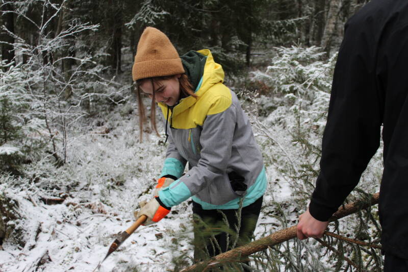 De tweede zondag dat ik hier was, hadden ze een verrassingsuitje voor me gepland. Jakobs vader is de eigenaar van een groot stuk bos, en wij (Magnus, Katharina, Hanna, Jakob en ik) samen met Jakobs zusje gingen onze eigen kerstboom hakken!! En tot mijn grote blijdschap had het gesneeuwd, dus leek het bos net een winter wonderland! Ook verbaasde ik me enorm over hoe ze zich kleedden. Ik heb nog nooit van mijn leven zóveel kleren aangehad, maar goed ik ben in Zweden nu ;). We zochten een paar mooie bomen, en namen die mee naar de truck. Daarna liepen we een stukje verder naar een kampeerplek. We maakten een vuurtje en roosterden onze lunch. Jakob en Alice (zijn zusje) zijn opgegroeid in dit bos, en weten dus wel de weg. Nou niet dus... Na een verkeerde afslag genomen te hebben kwamen we uit in de middle of nowhere. En Alice en Jakob zeiden dat ze nog nooit zó erg verdwaald waren. Uiteindelijk werd het "papa to the rescue" en werden we in zijn truck opgehaald, waar we in het open gedeelte konden zitten. In deze eerste week hier, heb ik al zo'n ontzettend leuke dingen meegemaakt, en daar geniet ik echt volop van!