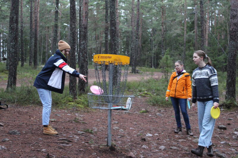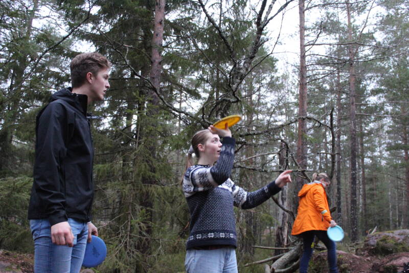 Hier in Zweden zijn er een heleboel bossen, en daar wordt ook gebruik van gemaakt. Er is hier een sport, frisbeegolf, die in de bossen gespeeld wordt. Het is hetzelfde principe als golf. Je hebt een korf en het is de bedoeling dat je in zo min mogelijk worpen je frisbee daarin gooit. Jakob en Magnus waren best goed, maar voor mij was de uitdaging meer om niet mijn frisbee keihard een boom in te knallen. Het is niet helemaal mijn sport, je moet best lang wachten op je beurt, en dan weer een stuk lopen, en dan weer je frisbee zoeken. Maar voor een keertje was het best vermakelijk.