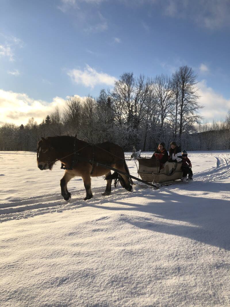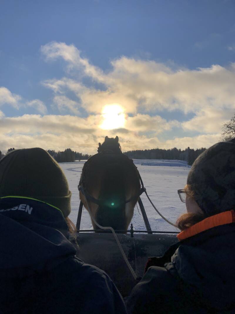 Ook ben ik met Alice naar haar tante geweest, zij heeft paarden (net zoals een heleboel mensen hier) en een slee. En daar hebben we een ritje gemaakt door de sneeuw. De zon scheen, en de lucht was blauw. Het was niet koud, en dat was echt zo super gaaf en gezellig! Iets wat ik zeker vaker zou willen doen. In de familie van Jakob hebben een heleboel mensen een boerderij, met paarden, schapen, koeien of kippen. En eerlijk gezegd, nu ik al die dieren hier zie, lijkt me dat zo ontzettend leuk om zelf te hebben, dus misschien wordt de droom van kleine Lobke, die graag een schapenboerderij wilde, toch waar gemaakt in de toekomst ;).